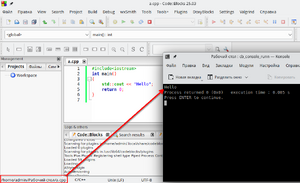 Внимание! При сохранении программ и проектов в Code::Blocks нельзя использовать пробелы и русские буквы в именах файлов и в именах всех папок в полном пути к файлу, это может привести к некорректной работе компилятора или отладчика в среде Code::Blocks. В частности, не следует сохранять файлы на "рабочем столе" или в домашнем каталоге пользователя в Windows, если имя пользователя содержит русские буквы или пробелы.