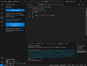 Компиляция и запуск приложения может занимать продолжительное время, вывод программы "Hello, C++!" также будет в панели "Терминал", при этом среда разработки может переключиться на панель "Консоль отладки".