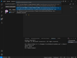 Теперь после нажатия на кнопку запуска, появится меню выбора конфигурации запуска. Необходимо выбрать конфигурацию, в названии которой есть g++: "C/C++: g++.exe сборка и отладка активного файла".