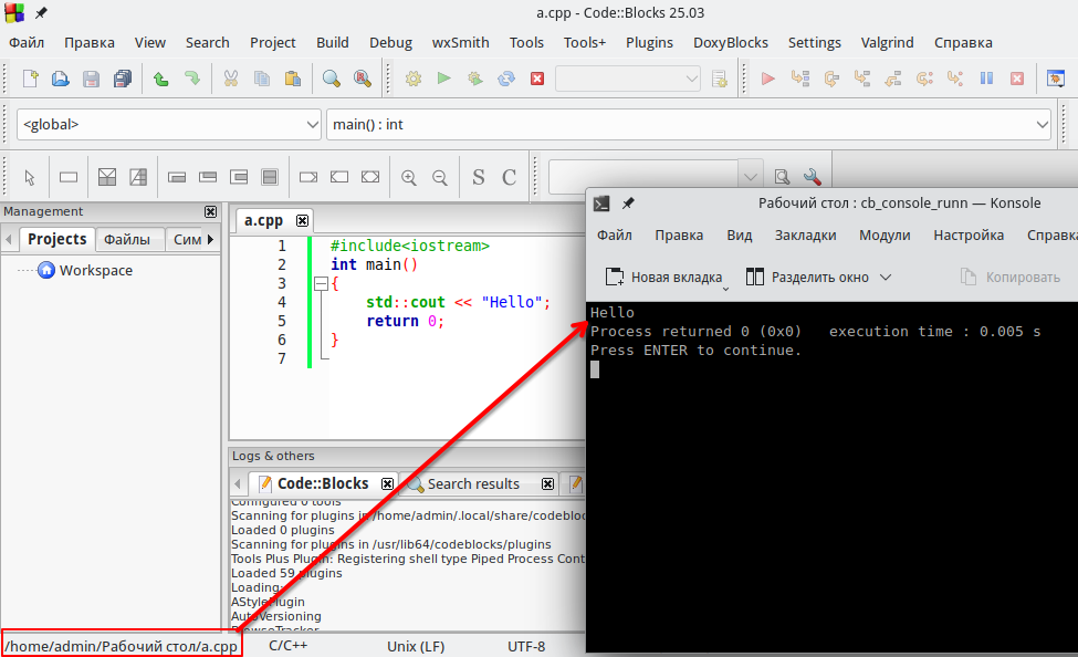 Компиляция и запуск файла без создания проекта при настройке среды Code::Blocks